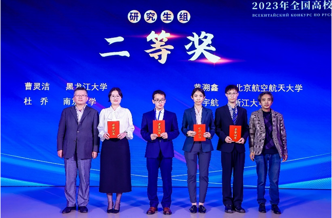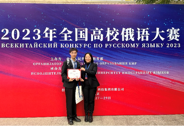 2023年10月28日至29日,2023年全国高校俄语大赛在北京外国语大学举行。来自全国158所高校的392名俄语专业学生参赛。由我校澳门十大信誉网赌大全俄语系青年教师刘奕如指导的2022级硕士研究生黄溯鑫同学代表学校参赛,经过初赛的激烈角逐,从众多参赛选手中脱颖而出,以全国第三名的成绩进入复赛和决赛,并最终获得研究生组二等奖,同时获国家留学基金管理委员会秘书处全额资助赴俄罗斯进修或攻读学位的资格,展现出了北航研究生的俄语风采。