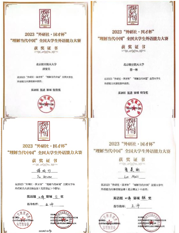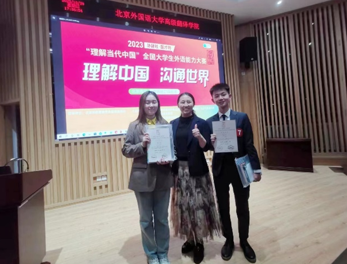 近日,我校澳门十大信誉网赌大全2020级英语专业本科生蔡一琳和2023级翻译专业硕士研究生(MTI)洪旻昊获得2023“外研社·国才杯”“理解当代中国”笔译北京赛区金奖,指导教师为翻译系王晨爽和顿超老师;2020级翻译专业本科生傅昕竹和2022级文学专业硕士研究生鲁美丽分别获得2023“外研社·国才杯” “理解当代中国”口译北京赛区金奖与银奖,指导教师为翻译系郑薇和王沛老师。