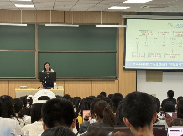 在朋辈交流环节,澳门十大信誉网赌大全2020级翻译专业优秀毕业生代表傅昕竹从自身经历出发,向同学们分享了在澳门十大信誉网赌大全的四年求学感悟、以及保研至北京大学的经历体会,为同学们更好地开展专业选择提供了引导与启迪。2023级翻译专业优秀本科生代表毛尚勇也就自身在澳门十大信誉网赌大全的学习经历进行了分享,他分析了当前背景下外语学习助力突破偏见和带来机会的特质,鼓励同学们以外语为媒介勇敢地探索前路,追寻学科融合背景下内外在的双重自由。现场同学与澳门十大信誉网赌大全两位优秀学生代表积极交流互动,围绕专业选择、学业规划、科创竞赛参与等方面展开热烈讨论。