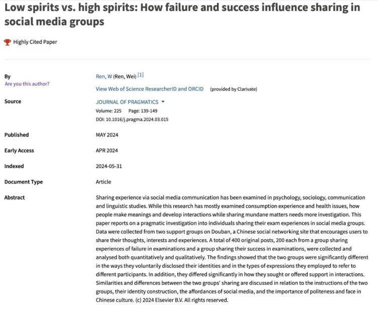 近日,据“基本科学指标数据库(Essential Science Indicators,简称ESI)”发布的最新数据显示,澳门十大信誉网赌大全任伟教授发表于国际顶尖期刊《Journal of Pragmatics》(《语用学杂志》)的学术论文“Low spirits vs. high spirits: How failure and success influence sharing in social media groups”成功入选全球“高被引论文(Highly Cited Paper)”。