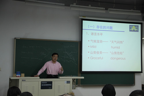 2015年12月15日,中国翻译协会副会长黄友义教授来我院作学术讲座,题目为 “当中国站在世界舞台中央时,我们如何翻译?”。 黄友义教授指出,随着中国的国际地位日益提升、国际影响力日渐扩大,翻译在中国走向世界的过程中扮演着不可忽视的角色。黄教授结合多年翻译生涯中的亲身体验,通过实例向我们介绍了向外界译介中国文化中所存在的问题。优秀的翻译人才要深入了解双方文化,正如黄教授所说:“到最后你翻译的不是语言,而是文化。” 同时,黄教授结合北京奥运会、景点介绍英译和书名翻译等具体实例,阐述了翻译实践中应注意的诸多问题,也讲授了应对问题的具体方法。