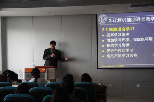 11月10号下午,我院有幸邀请到中国人民大学澳门十大信誉网赌大全副院长贾国栋教授进行学术讲座。贾教授的讲座题目为“计算机辅助语言教学的发展、现状及趋势”。在讲座中,贾教授首先简要介绍了计算机辅助语言教学的发展历程,强调几个典型发展阶段及各阶段教学重点。然后重点讲述教学与研究的现状,包括理论基础、教学案例、研究重点及方法等。最后,贾教授根据信息技术的发展对该领域未来主要的发展方向和可能的研究选题作出了展望。