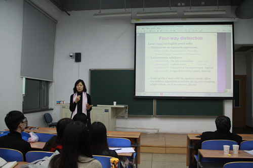 2015年11月20日,香港城市大学刘美君教授应邀来北航澳门十大信誉网赌大全做了一场题为Emotion Verbs in Chinese and English 学术报告。中英文在情绪动词的词汇化现象上差异很大,各自展现非常独特的语法语义表现。在主词角色的选取上,英文多以外物刺激为主体;而中文较缺乏以外物刺激为主体的动词词汇,在形式与意义的搭配上,也呈现有别于其他语言的歧义与多义现象。该研究旨在全面探讨分析中文情绪动词的多样化表现,厘清构词、语法、和语义各层次的特征与互动关系,最终提出一套基于框架语义及构式语法的分析架构及分类标准,并完成各次类动词的语义标记,统整情绪动词的词汇关系,并进一步厘清中英文的差异,以建构“中文动词语义网”。该研究的主题切中近年神经心理语言学及自然语言处理的重要课题,其结果对新兴的“情感”表征研究有独到的贡献。