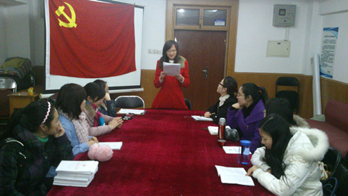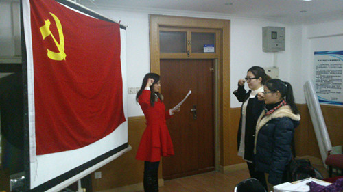 在庄严的《国际歌》中,大会正式开始。党支部书记张丹首先介绍了两位入党积极分子胡晓方、尹作磊的基本情况,并提议到会党员同志对她们是否具备加入中国共产党的资格进行讨论。刘金龙、张爱娥分别发表了看法。他们认为,胡晓方、尹作磊两位同志在学习上勤奋刻苦,在工作上积极向上,在生活中乐于助人,建议党组织批准其加入。随后,到会党支部成员就此进行了举手表决,一致推举胡晓方、尹作磊同志加入党组织。表决过后,在党支部书记张丹的带领下,胡晓方、尹作磊面对鲜艳的党旗进行了庄严的宣誓。并表示会不负党的重托,再接再厉,争取早日成为一名合格的共产党员。
